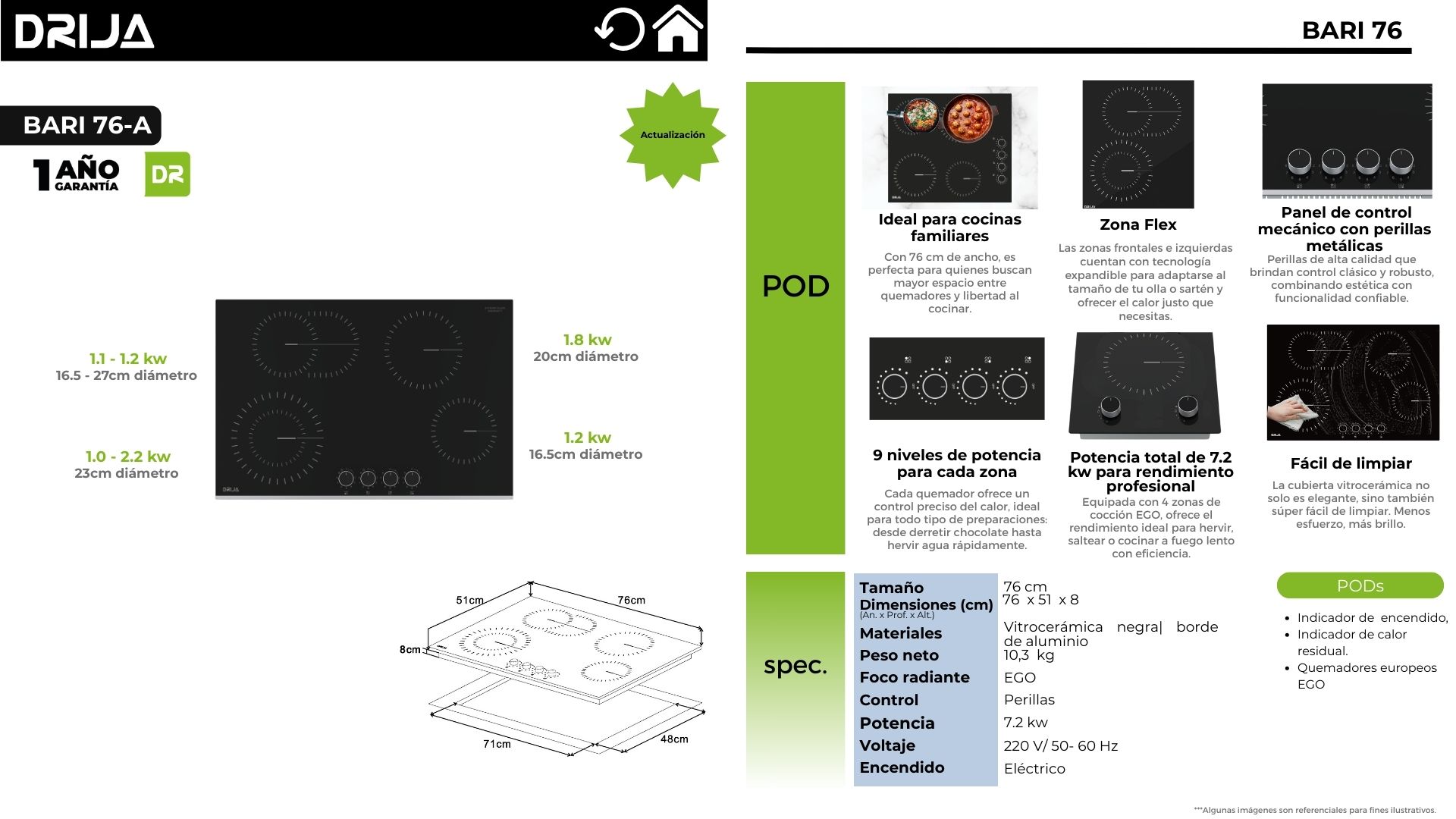 La BARI 76-A es una estufa eléctrica vitrocerámica de 76 cm, pensada para cocinas familiares que necesitan más espacio entre zonas de cocción y un control preciso. Su superficie vitrocerámica negra con borde de aluminio aporta un look moderno, es resistente y se limpia fácilmente. Integra 4 zonas de cocción (incluyendo ZONA FLEX), perillas metálicas de control mecánico y tecnología EGO para un desempeño confiable, con potencia total de 7.2 kW y 9 niveles de potencia por zona.