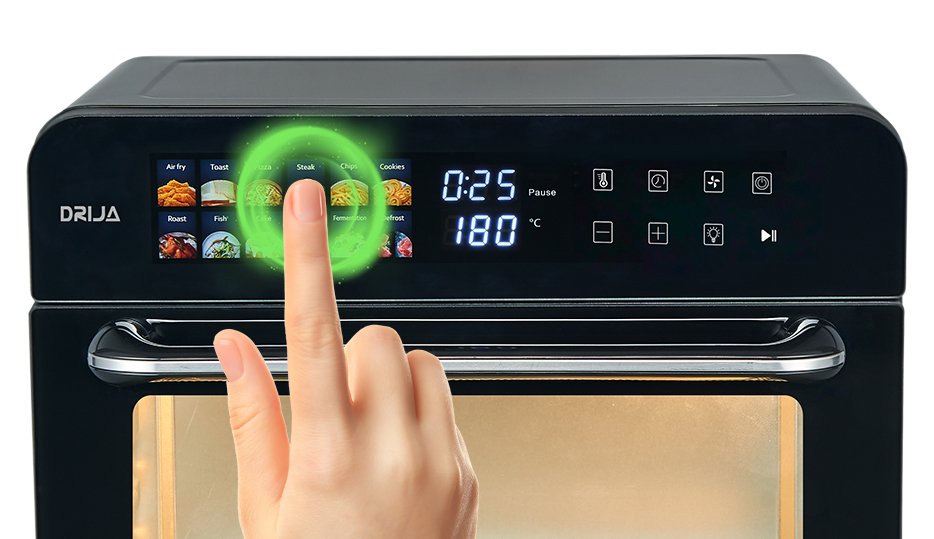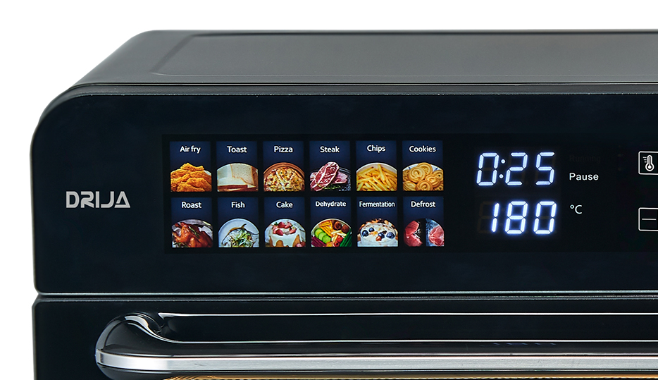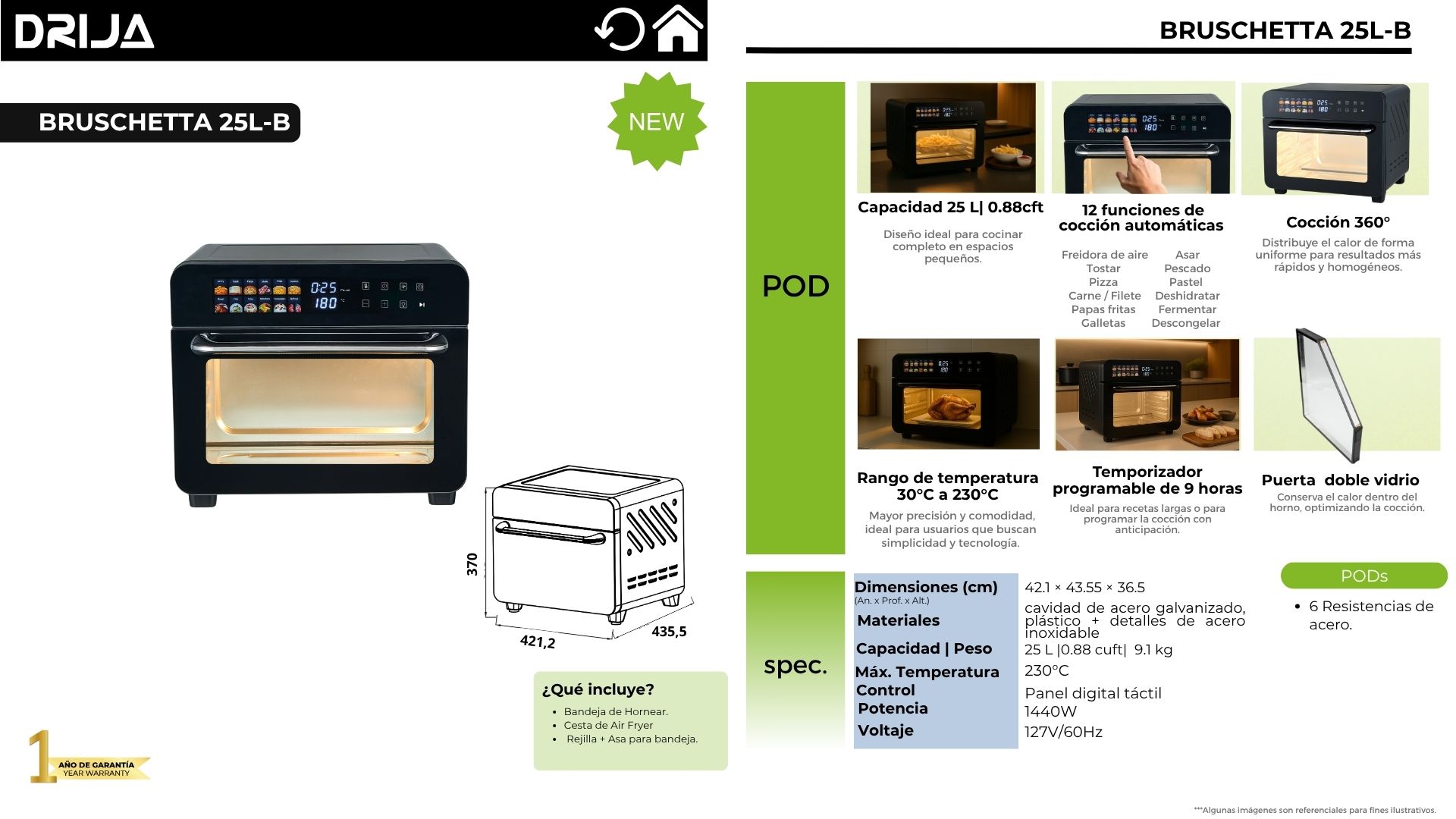 El BRUSCHETTA 25L-B de DRIJA es un horno freidora de aire compacto con capacidad de 25 L (0.88 cu ft), ideal para espacios pequeños sin renunciar a la versatilidad. Incorpora 12 funciones automáticas, cocción 360° para resultados homogéneos, rango de temperatura de 30 °C a 230 °C, y panel digital táctil para un control preciso. Su cavidad de acero galvanizado con puerta de doble vidrio optimiza la retención de calor. Incluye bandeja de hornear, cesta Air Fryer, y rejilla con asa para manejarla con seguridad.