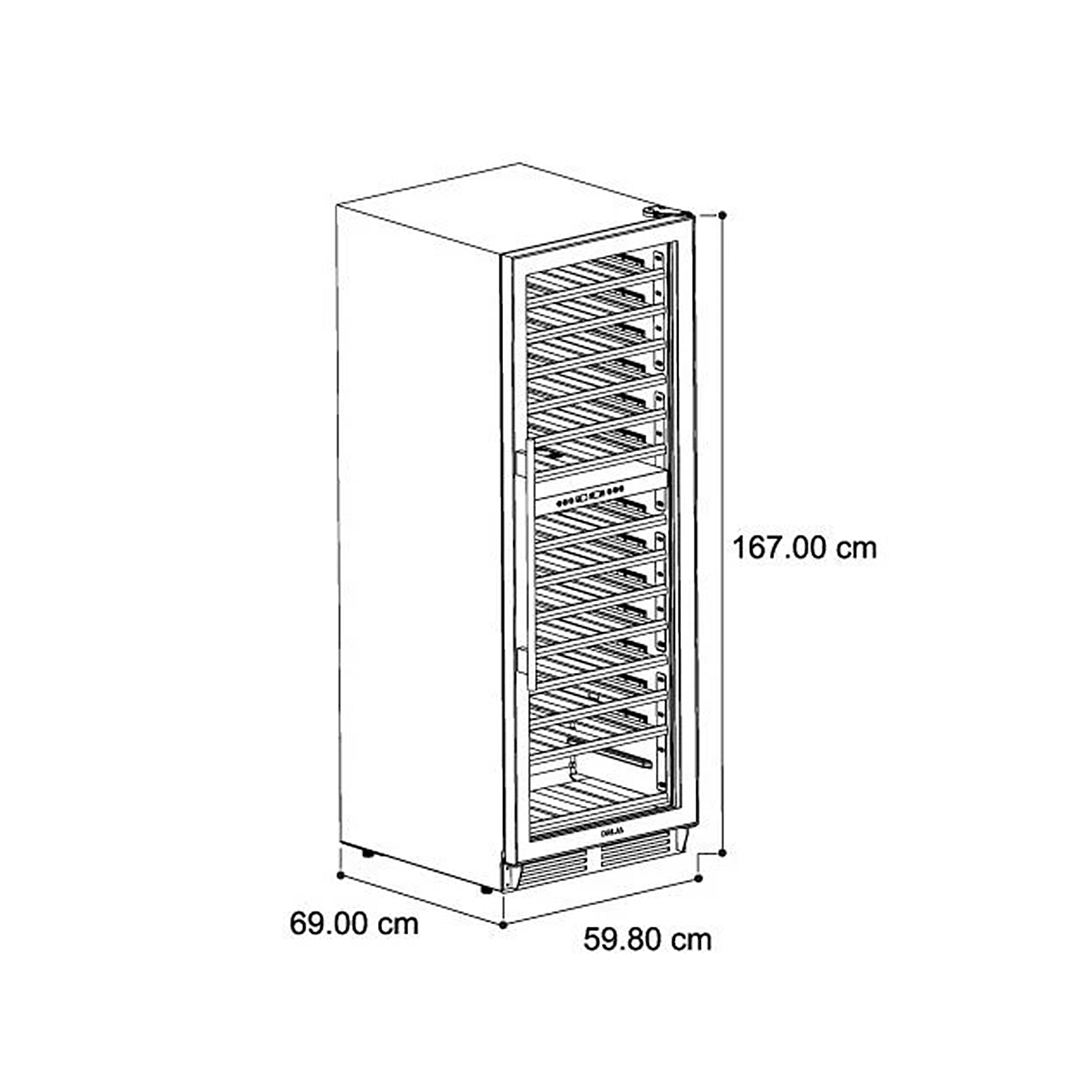 La vinera Chianti 154 de DRIJA es una cava de gran formato, diseñada para verdaderos coleccionistas. Su capacidad para 154 botellas, doble zona de enfriamiento y estantes de madera barnizada permiten organizar tu colección con orden, elegancia y tecnología. Incorpora puerta de acero inoxidable con doble vidrio, iluminación LED blanca, control táctil y sistema de instalación flexible, ideal para empotrar o ubicar de forma independiente.