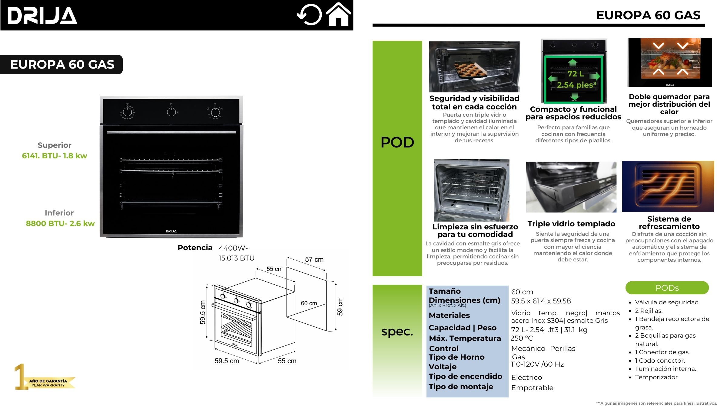 El horno Europa 60 de Drija eleva la experiencia culinaria con su triple vidrio templado, iluminación interior y doble quemador. Diseñado para quienes valoran la seguridad, eficiencia y una distribución uniforme del calor, este horno empotrable combina lo mejor del diseño moderno con funcionalidad profesional.