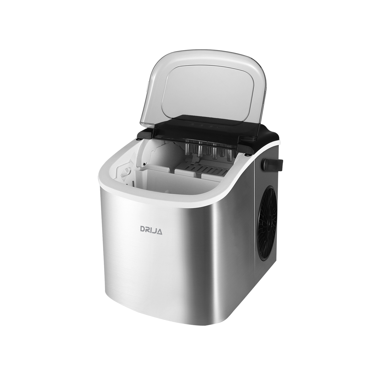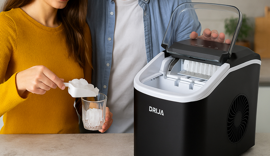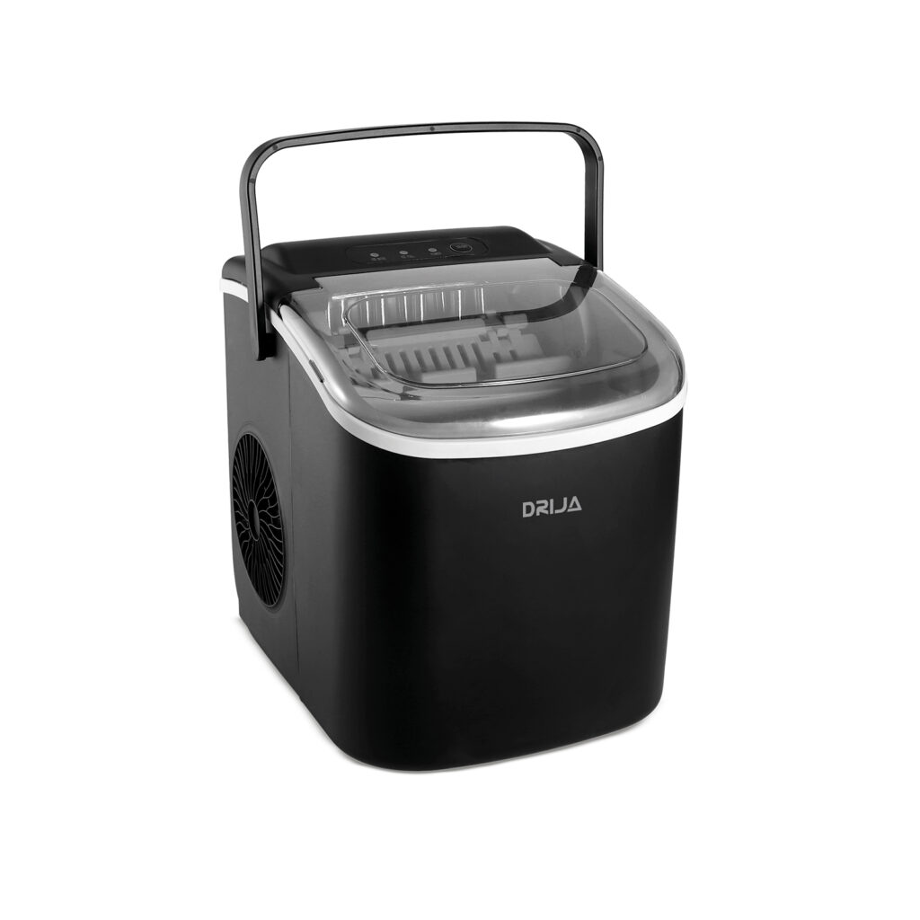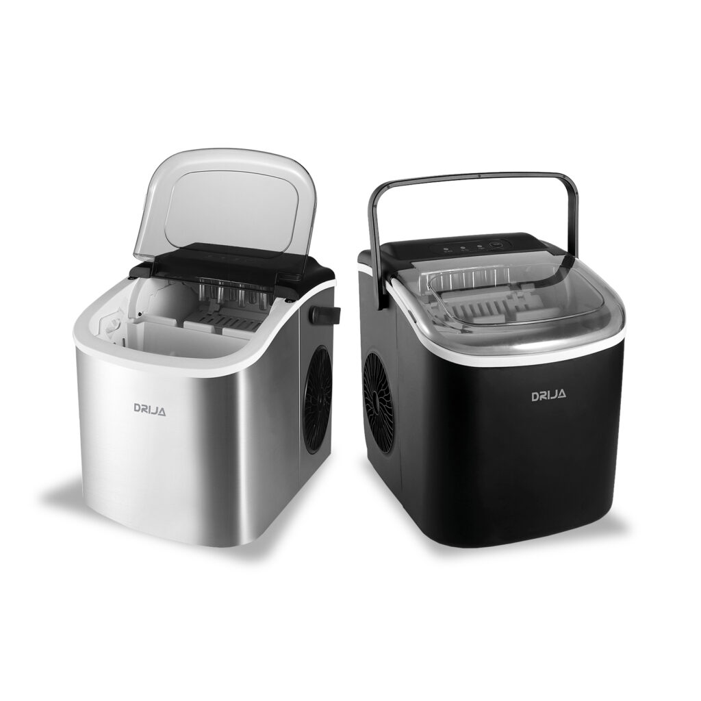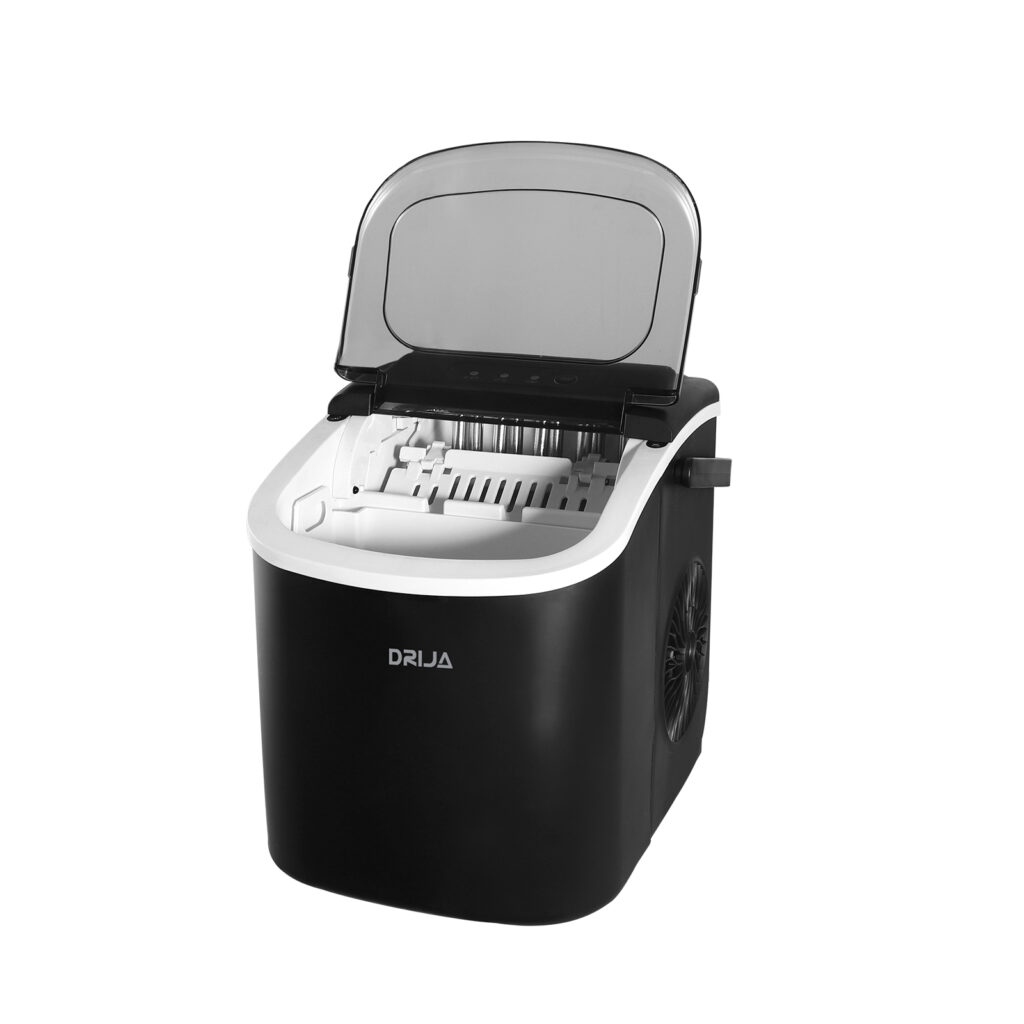 La FH12-INOX | BLACK de DRIJA es una máquina de hielo portátil, ideal para uso doméstico o en exteriores. Con capacidad de producción de 12 kg en 24 horas y depósito de 1.2 L, permite obtener 9 cubos de hielo en tan solo 7 a 12 minutos. Su diseño compacto y liviano, junto con la función de autolimpieza y panel táctil con indicadores luminosos, la convierten en una solución práctica y eficiente para tener hielo fresco en cualquier momento y lugar.