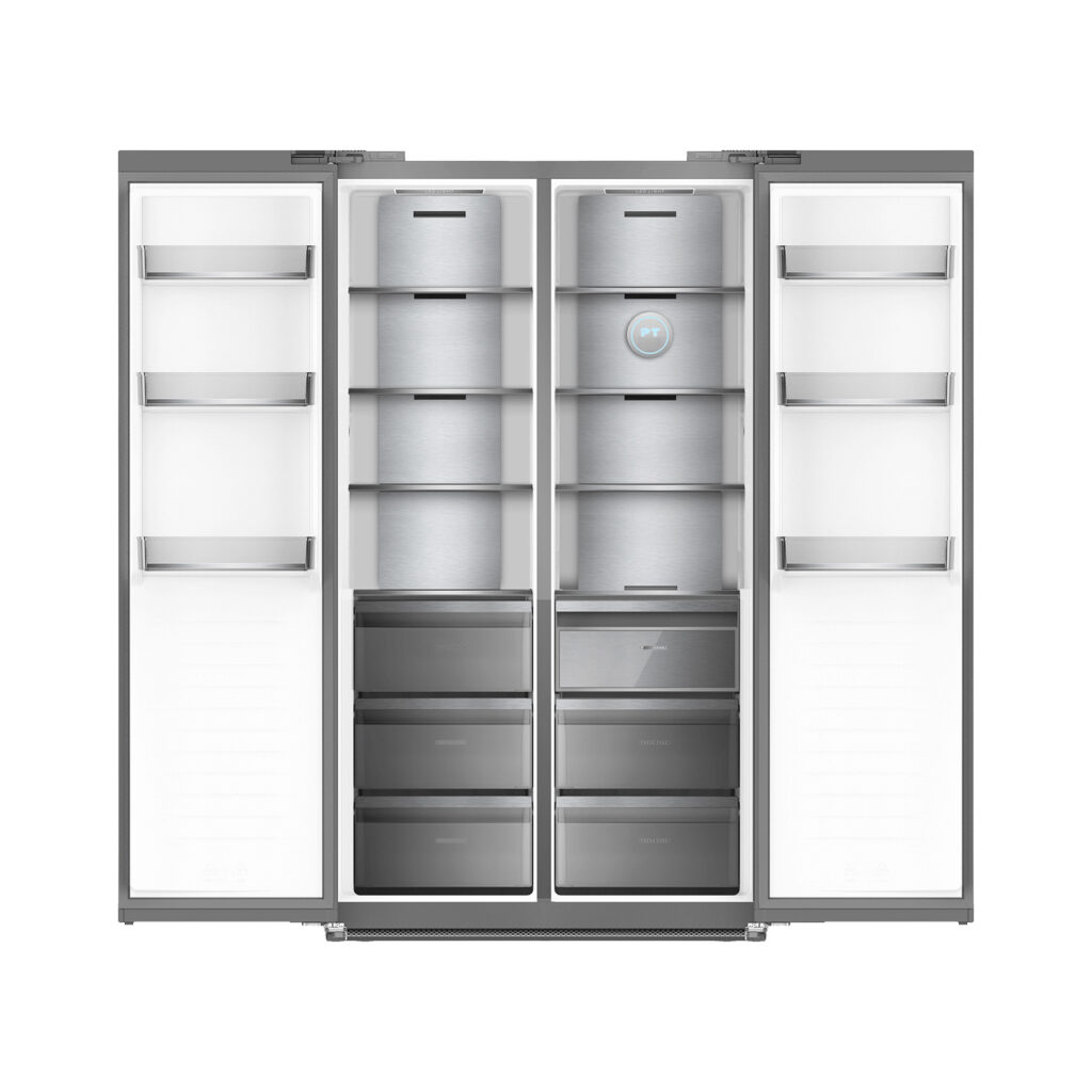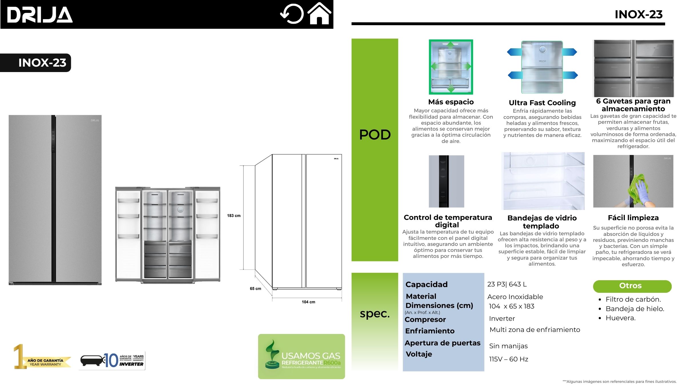 El refrigerador INOX-23 redefine el concepto de almacenamiento inteligente y eficiente. Con una capacidad de 643L, 6 gavetas de gran tamaño y bandejas de vidrio templado, este modelo se adapta a cualquier necesidad familiar. Su elegante diseño en acero inoxidable se complementa con funciones avanzadas como el Ultra Fast Cooling, panel digital de control de temperatura y filtro de carbón para eliminar olores. Todo esto en un formato moderno y fácil de limpiar.