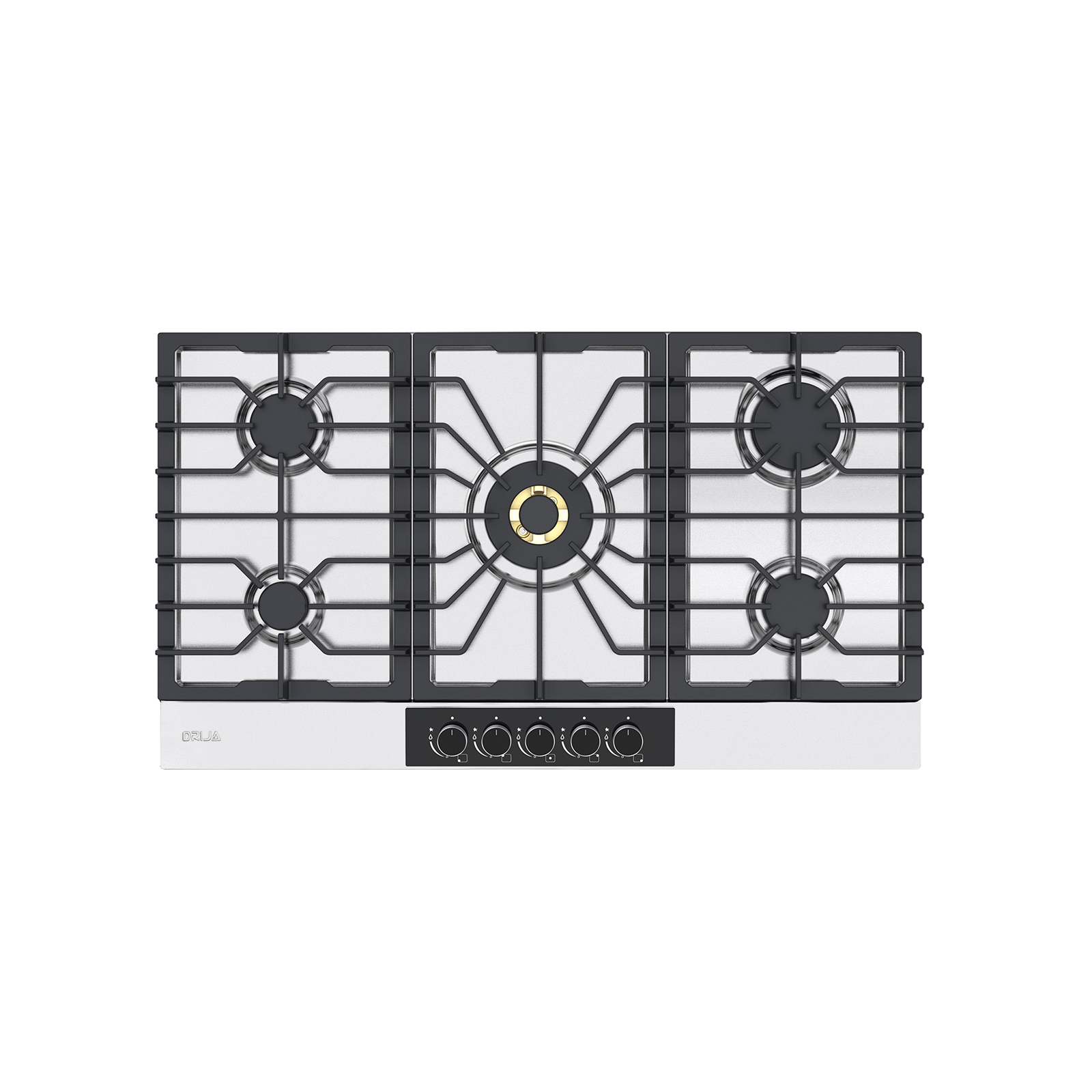 Superficie brillante de acero inoxidable que irradia elegancia y profesionalismo. Las parrillas de hierro colado negro resaltan con un estilo sólido e industrial.