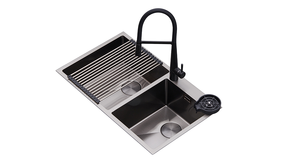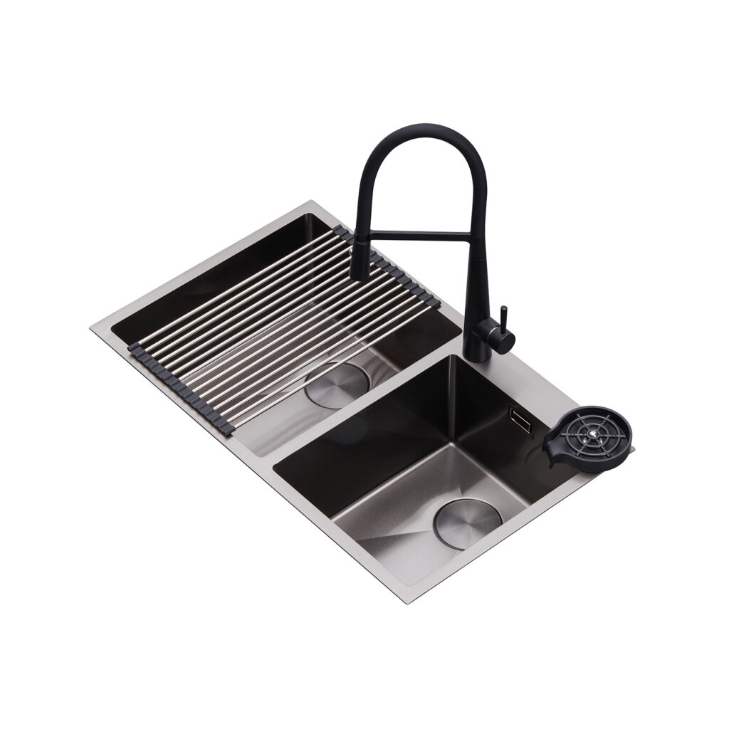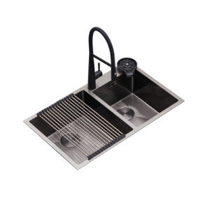 El fregador LUCCA 84 de DRIJA combina un diseño moderno con una doble tina que maximiza la funcionalidad en tu cocina. Fabricado en acero inoxidable 304 satinato con grifería negra monomando extraíble, este fregador incluye rejilla escurridora y enjuagador de vasos, elevando cada detalle de tu experiencia diaria. Su sistema anti-ruido y tecnología anti-rebose aseguran comodidad y seguridad en todo momento.