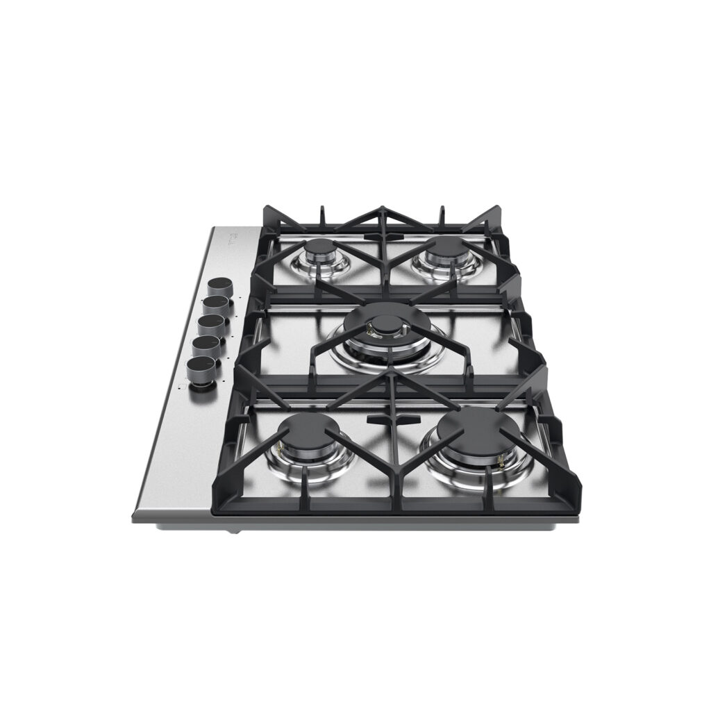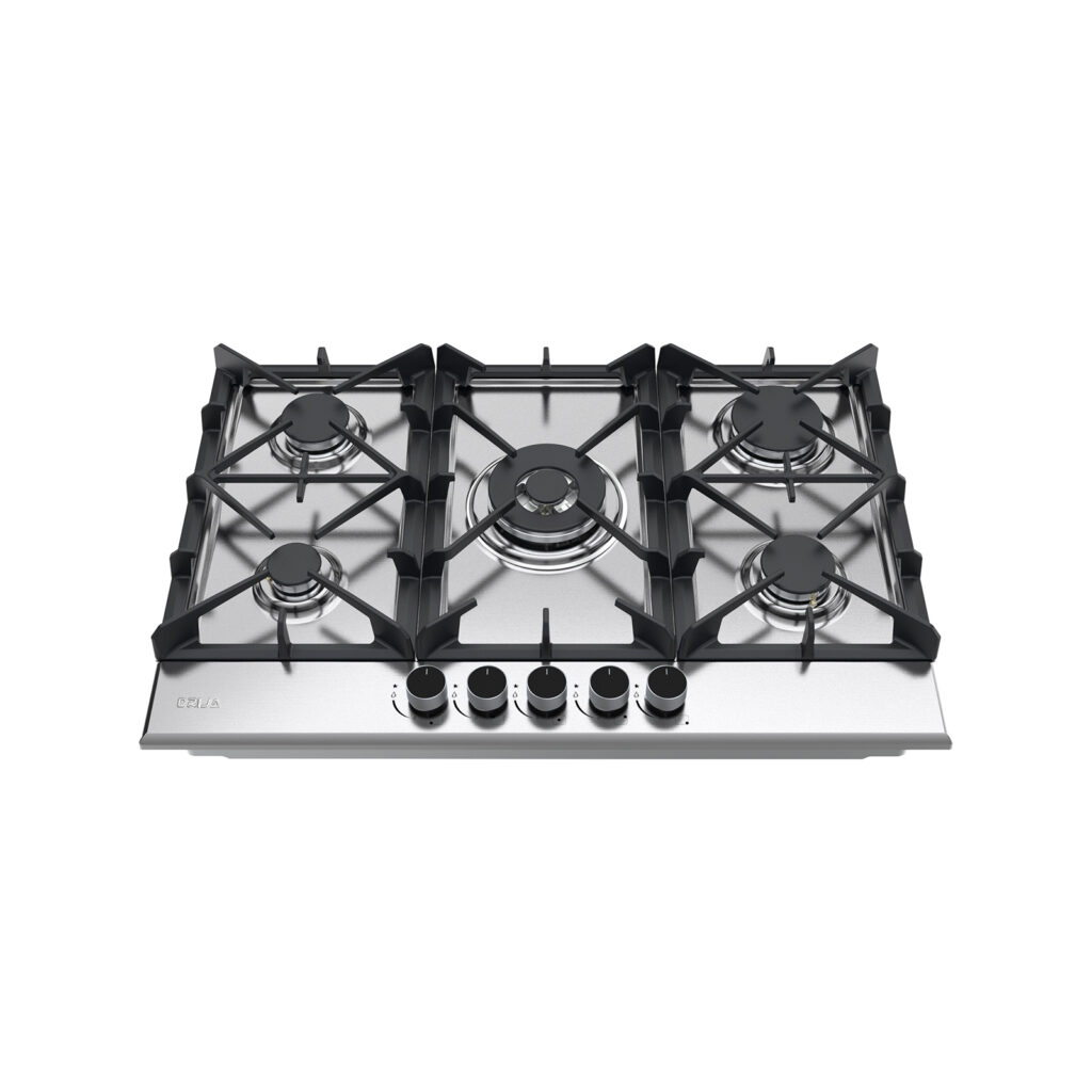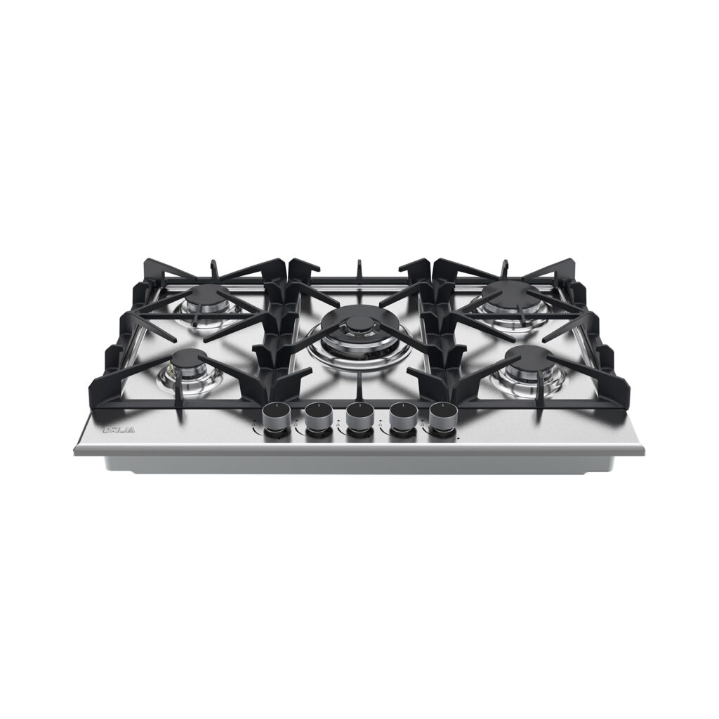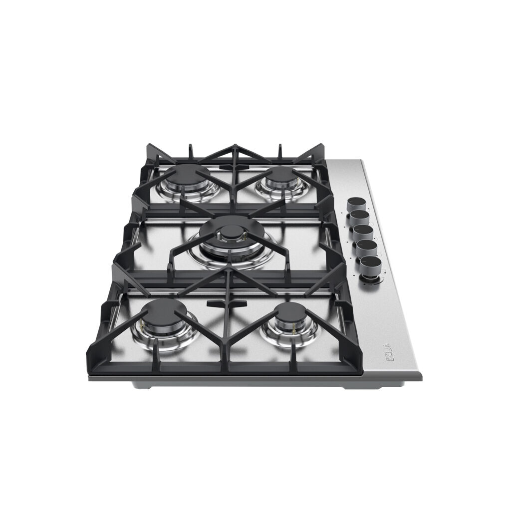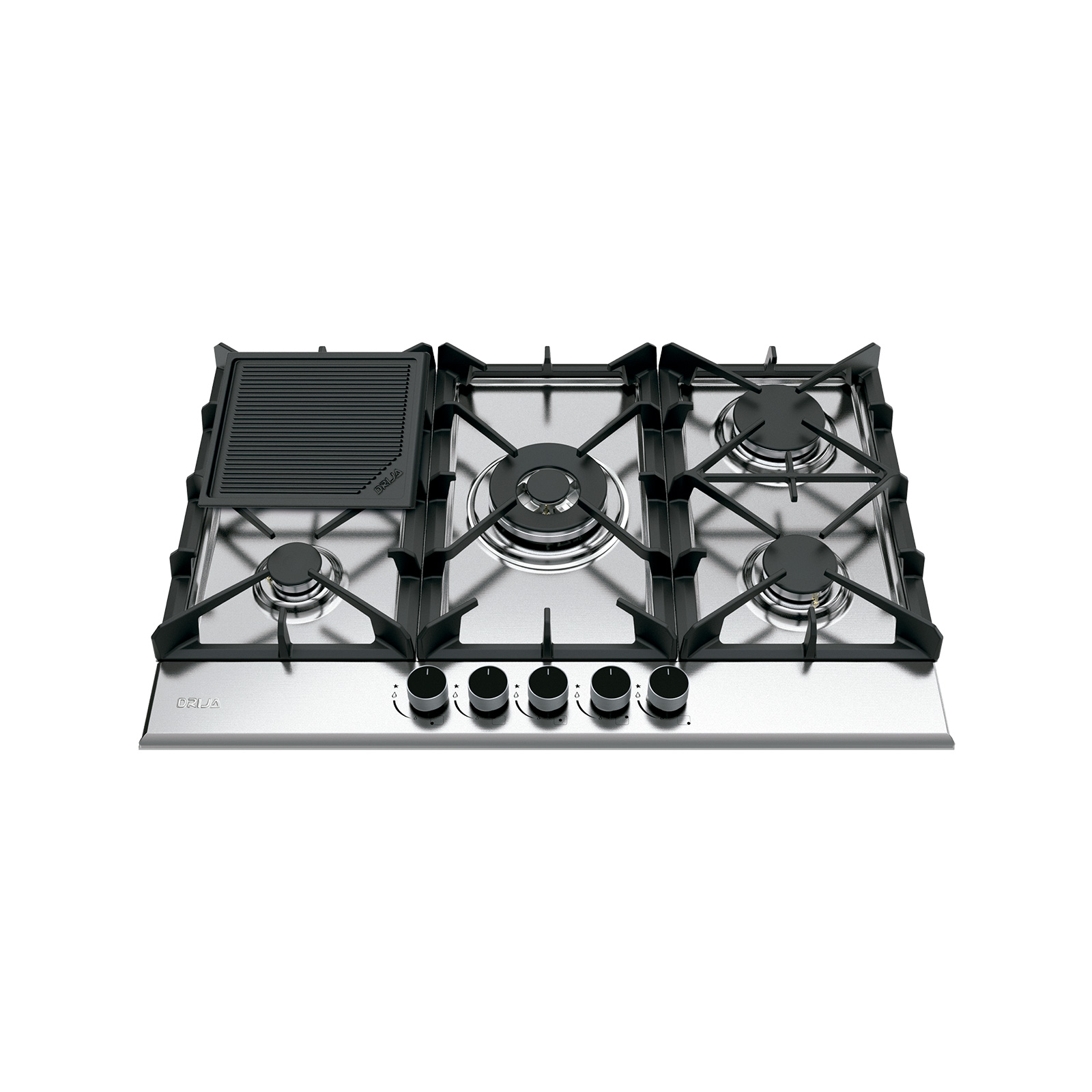 Estufa empotrable de 76 cm con cinco quemadores SABAF de alto rendimiento, incluyendo uno de triple corona. Diseño de acero inoxidable con plancha de hierro fundido para un uso versátil, ideal para cocinas exigentes.