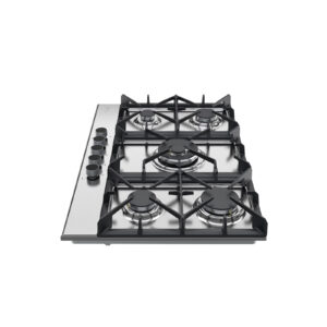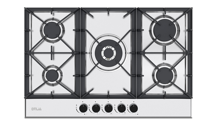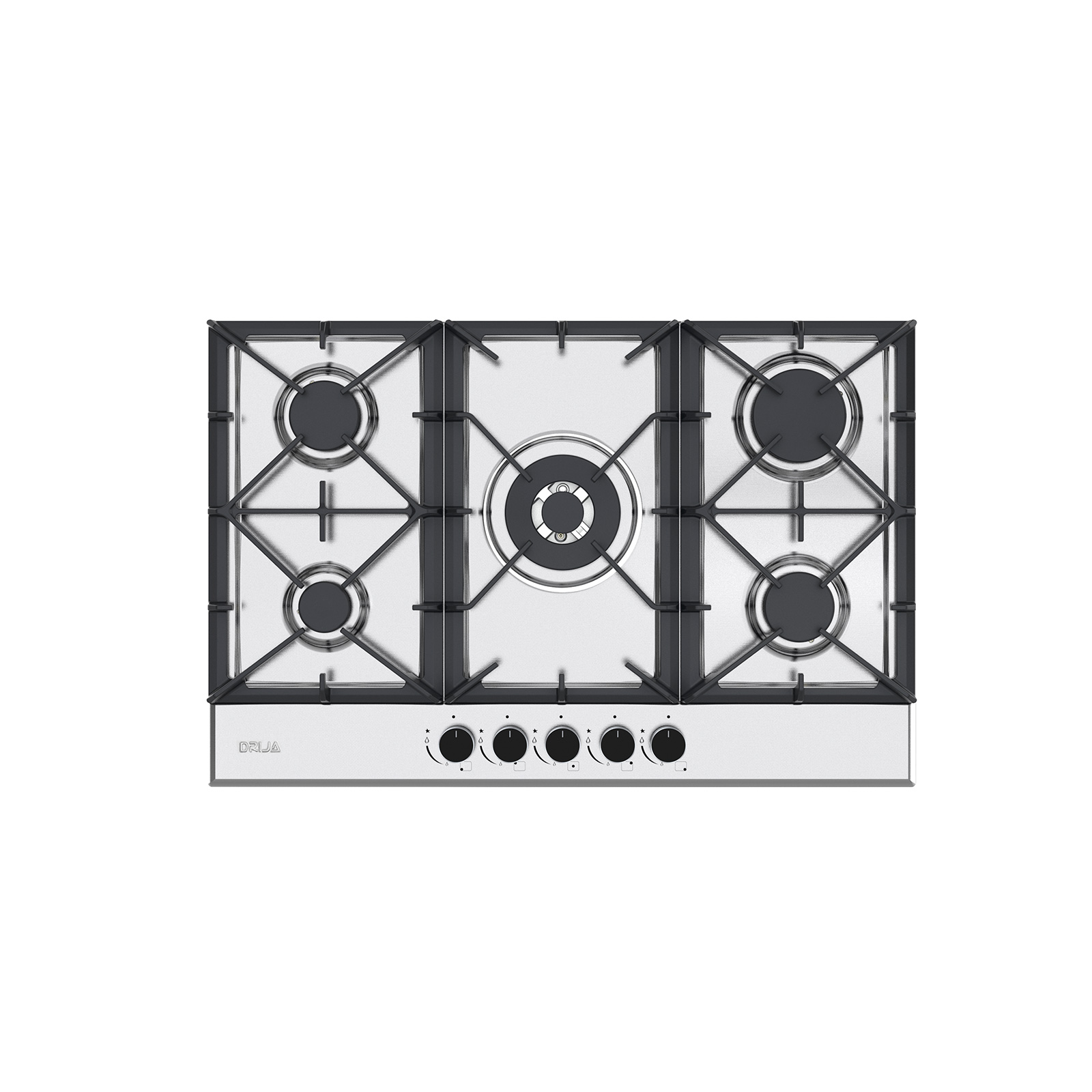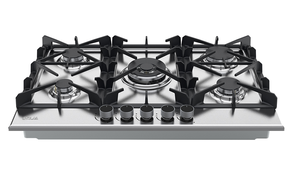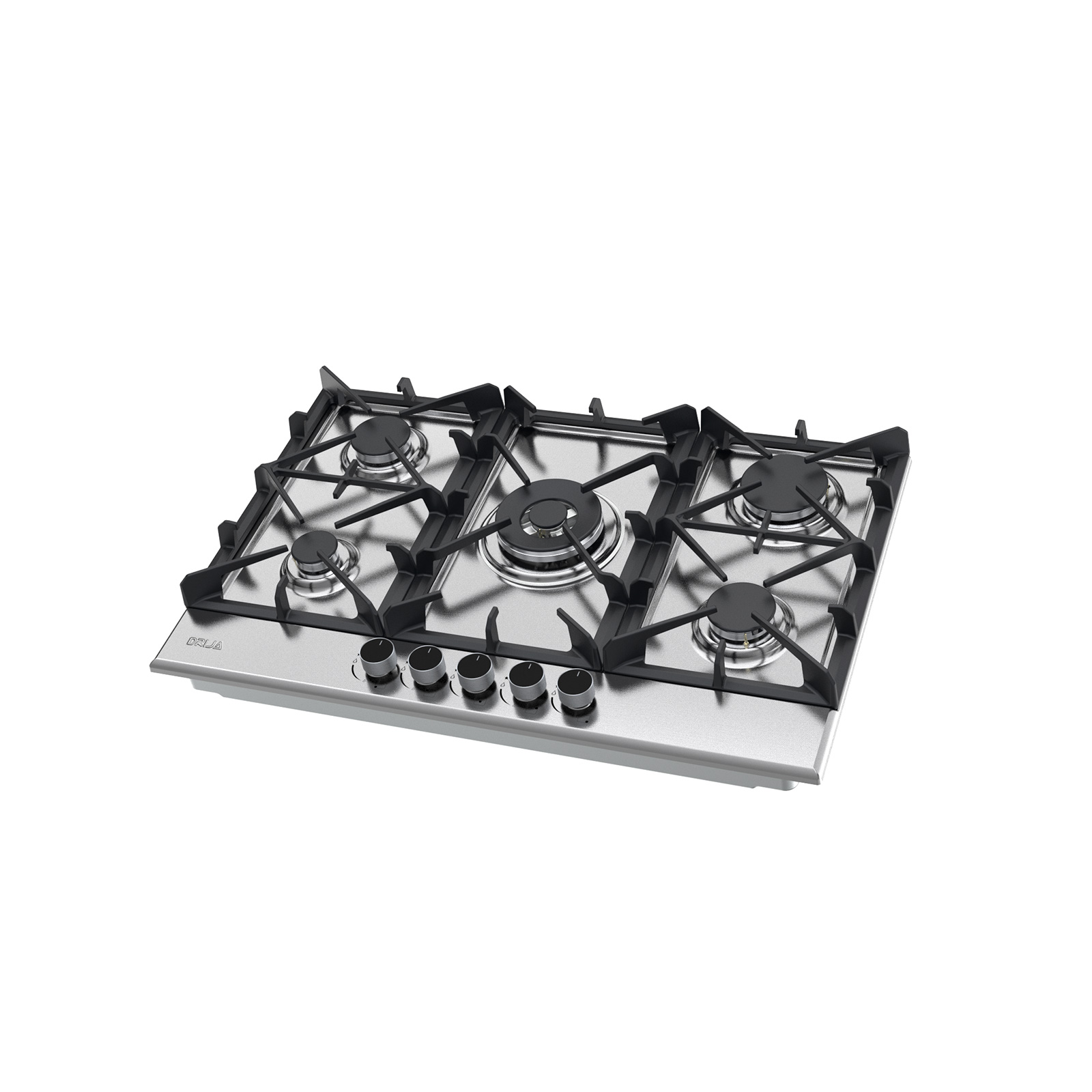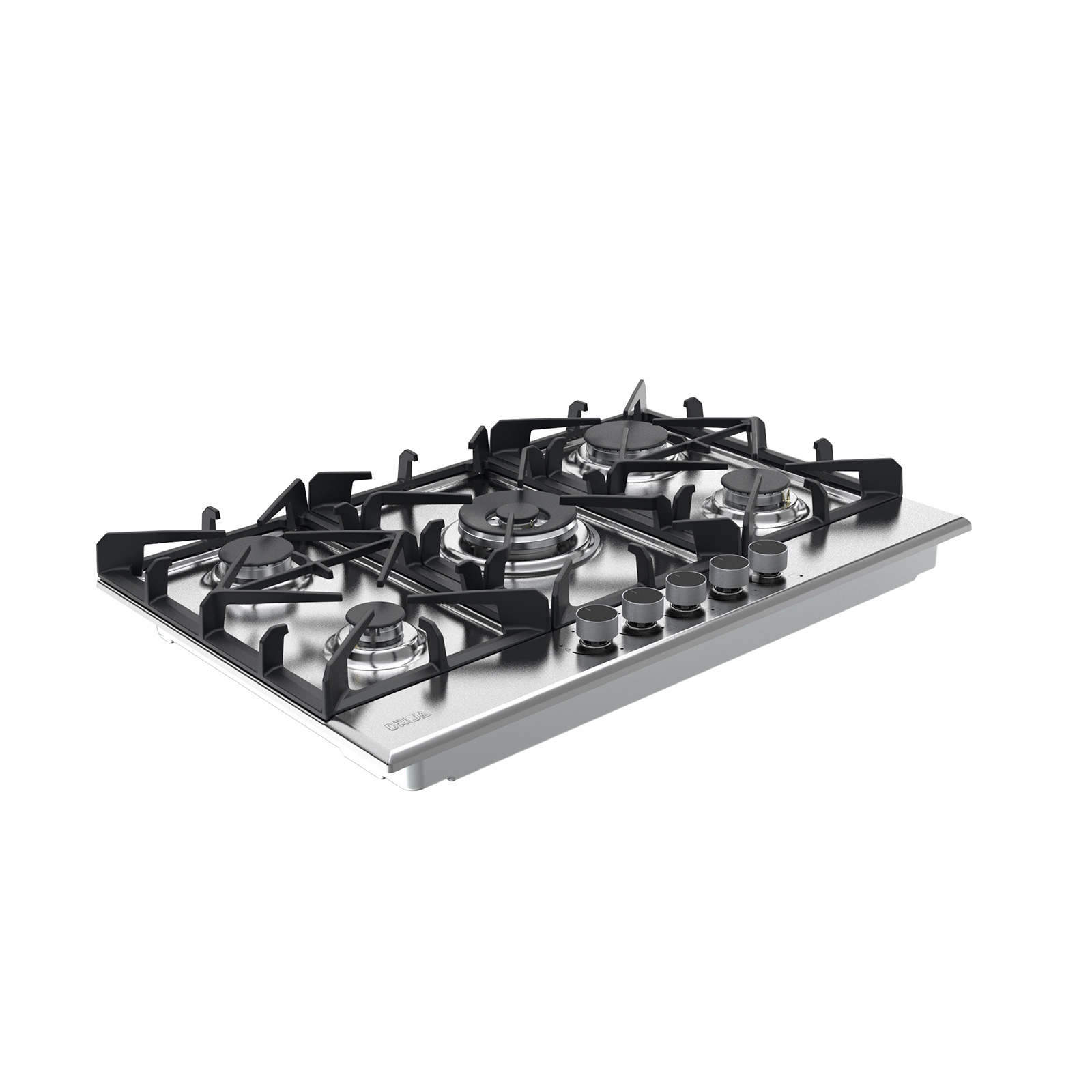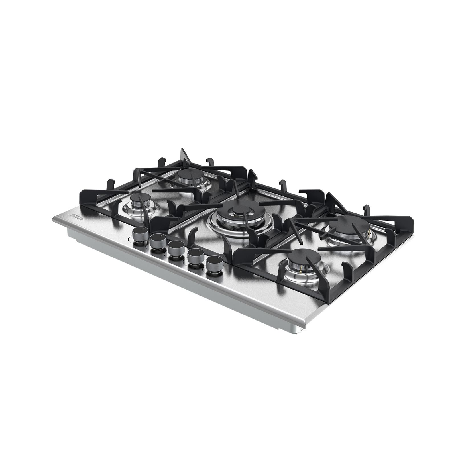 Estufa empotrable de 76 cm con cinco quemadores SABAF de alto rendimiento, incluyendo uno de triple corona. Diseño de acero inoxidable con plancha de hierro fundido para un uso versátil, ideal para cocinas exigentes.