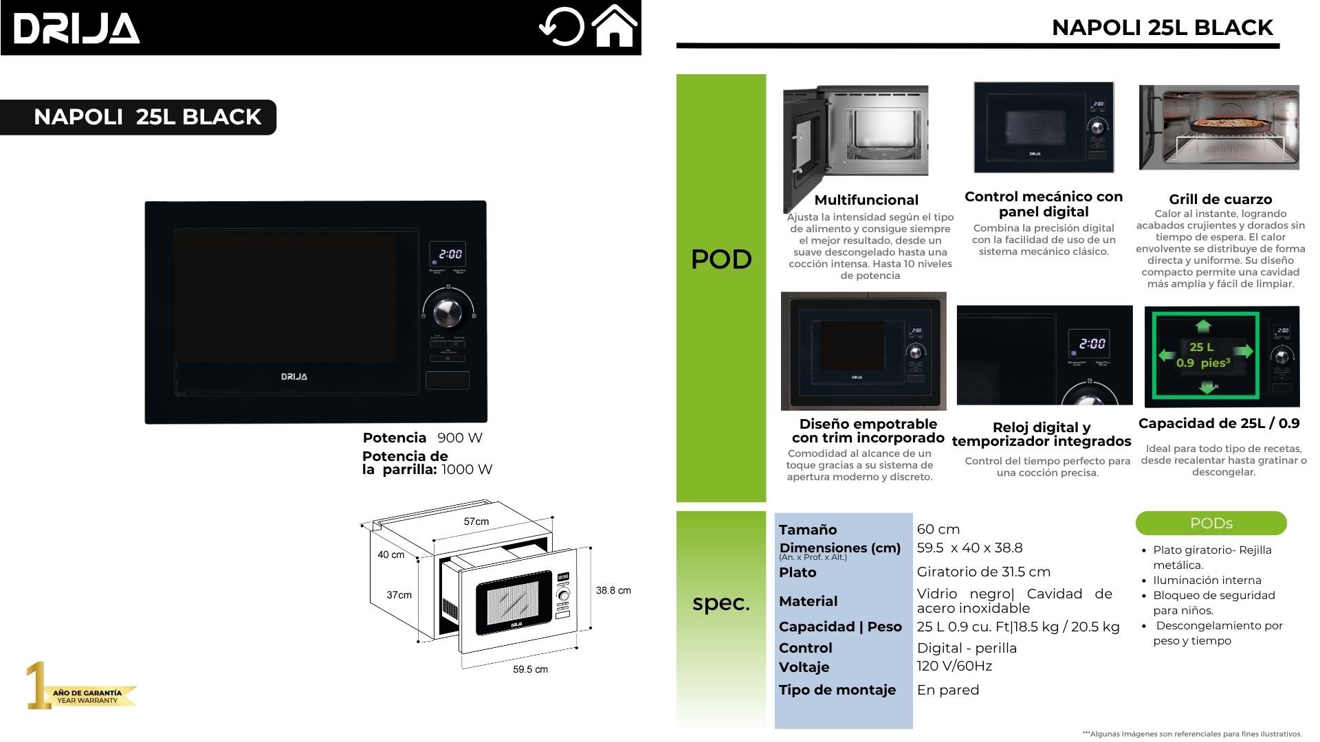 El Napoli Black 25L es un microondas empotrable que ofrece versatilidad, durabilidad y un estilo clásico. Su combinación de control mecánico con panel digital, grill de cuarzo y diseño con acabado negro mate, lo convierten en la solución ideal para quienes buscan practicidad sin renunciar a la estética. Compacto pero potente, con una capacidad de 25 litros y cavidad en acero inoxidable.