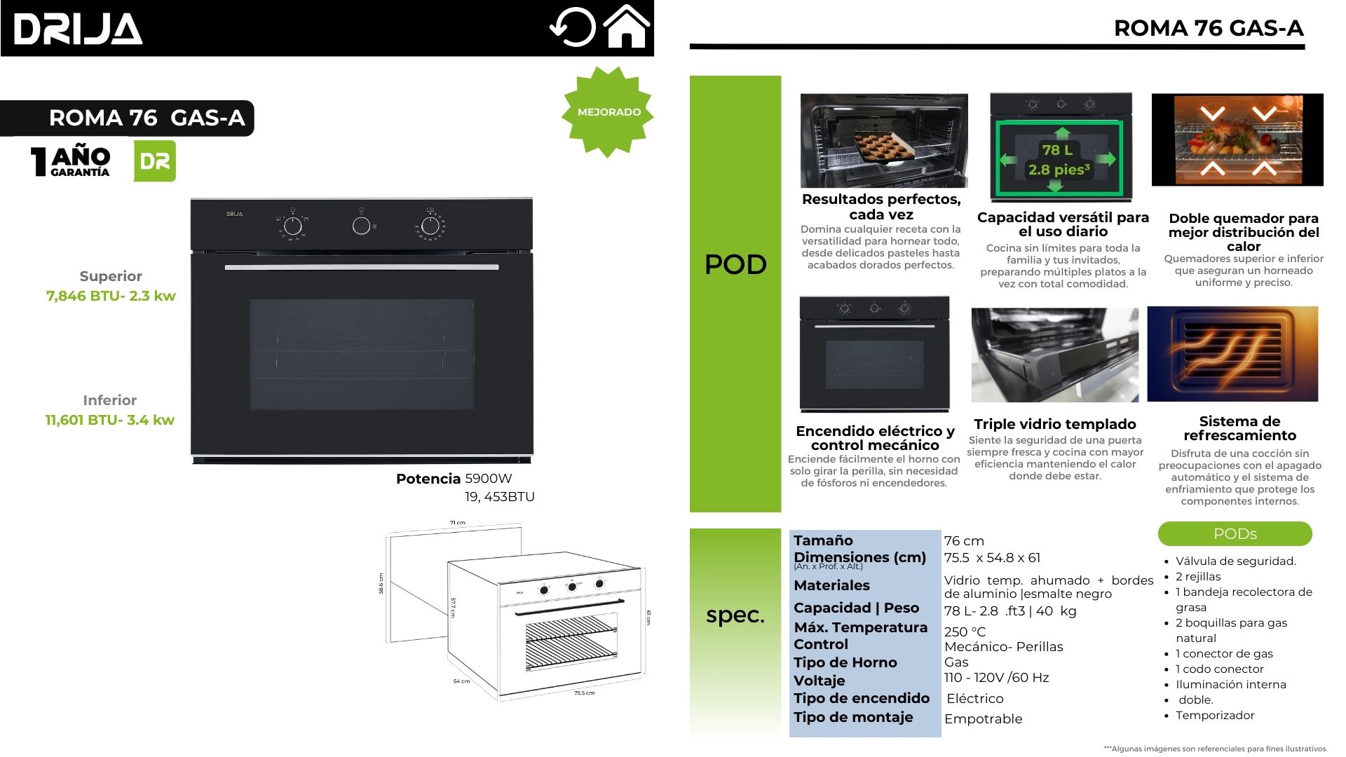 El horno empotrable ROMA 76 GAS-A está diseñado para quienes cocinan a diario y necesitan resultados consistentes. Su doble quemador (superior e inferior) mejora la distribución del calor para lograr cocciones más uniformes, mientras su puerta de triple vidrio templado aporta mayor seguridad y mejor aislamiento térmico. Además, integra sistema de refrescamiento para mantener la superficie más fresca y proteger los componentes internos, logrando una experiencia de uso más cómoda y confiable. Ideal para cocinas modernas que buscan rendimiento real, control tradicional por perillas y un acabado elegante en negro.