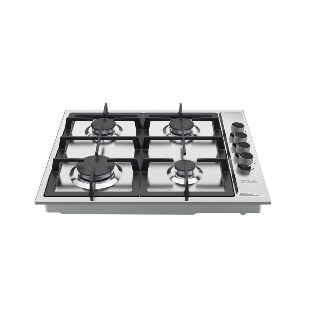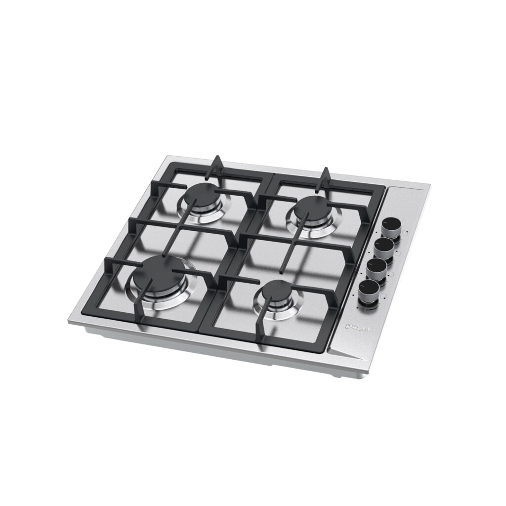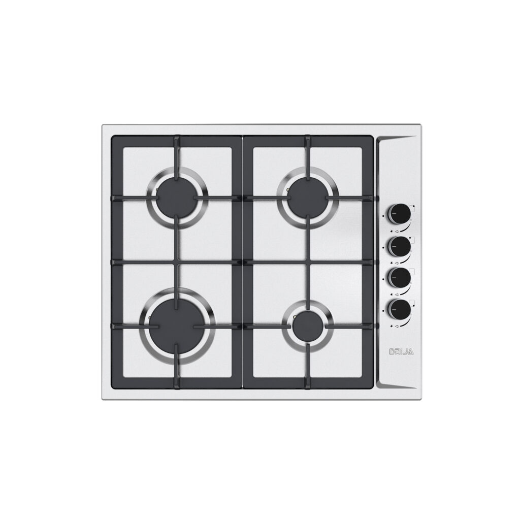 Estufa empotrable de 60 cm con cubierta en acero inoxidable y parrillas de hierro colado. Ofrece 4 quemadores de diferentes intensidades, sistema de válvulas de seguridad y diseño compacto ideal para cocinas funcionales y modernas.