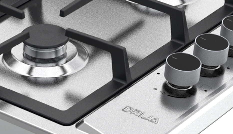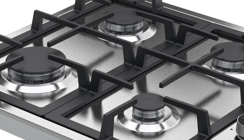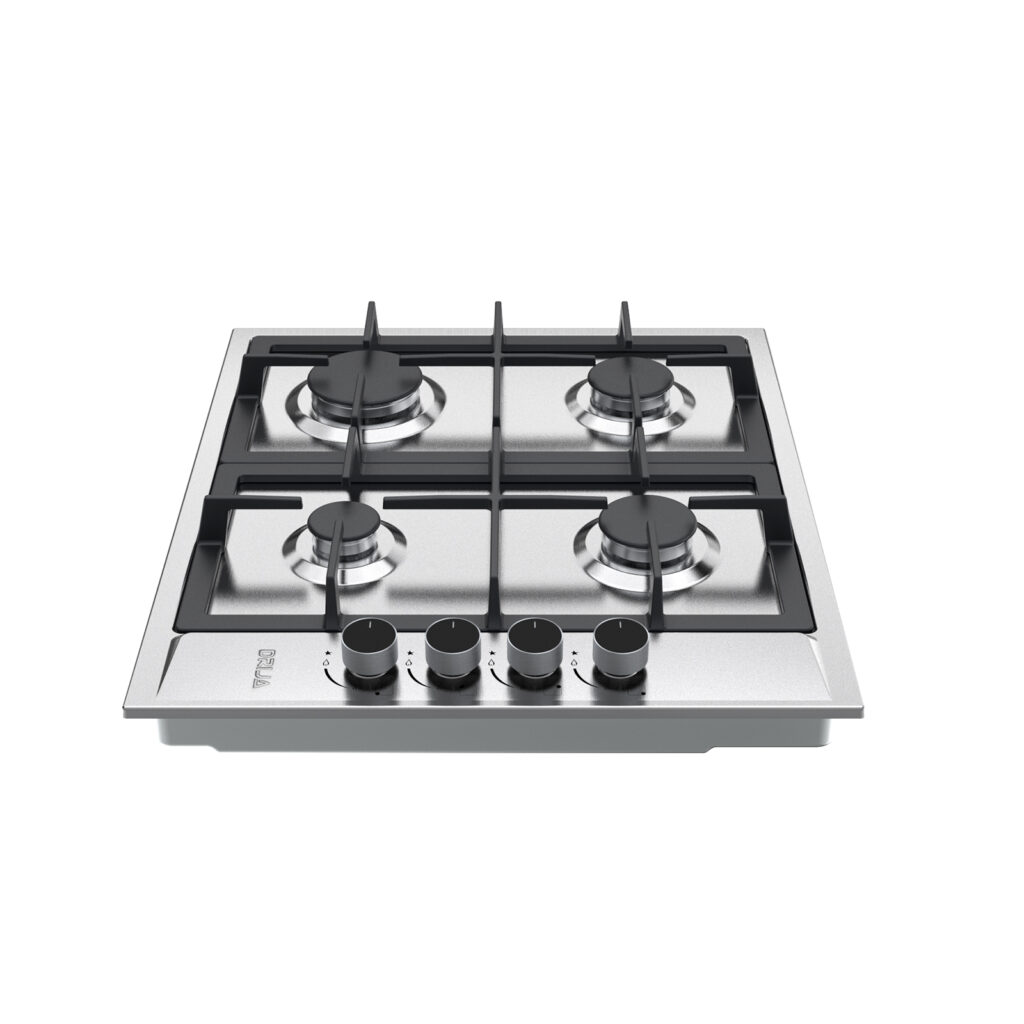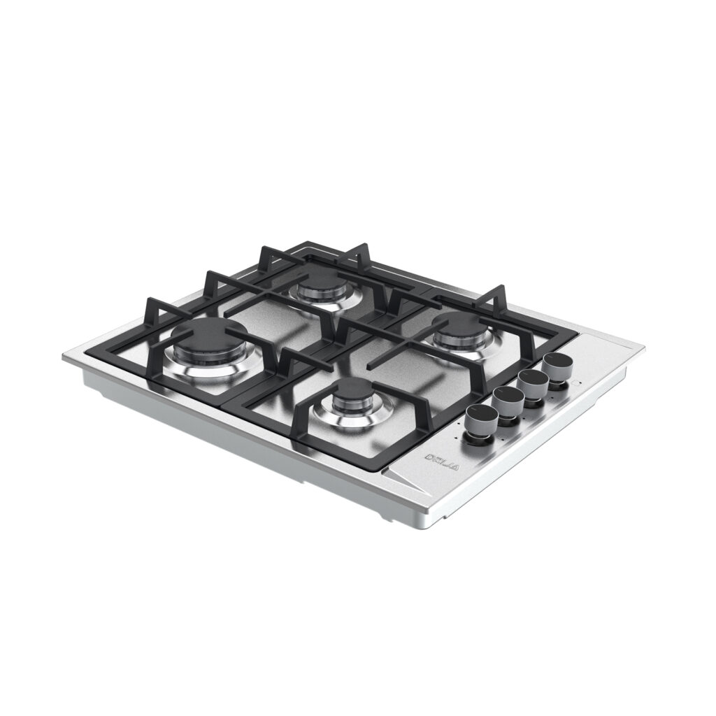 Estufa empotrable de 60 cm con cubierta en acero inoxidable y parrillas de hierro colado. Ofrece 4 quemadores de diferentes intensidades, sistema de válvulas de seguridad y diseño compacto ideal para cocinas funcionales y modernas.
