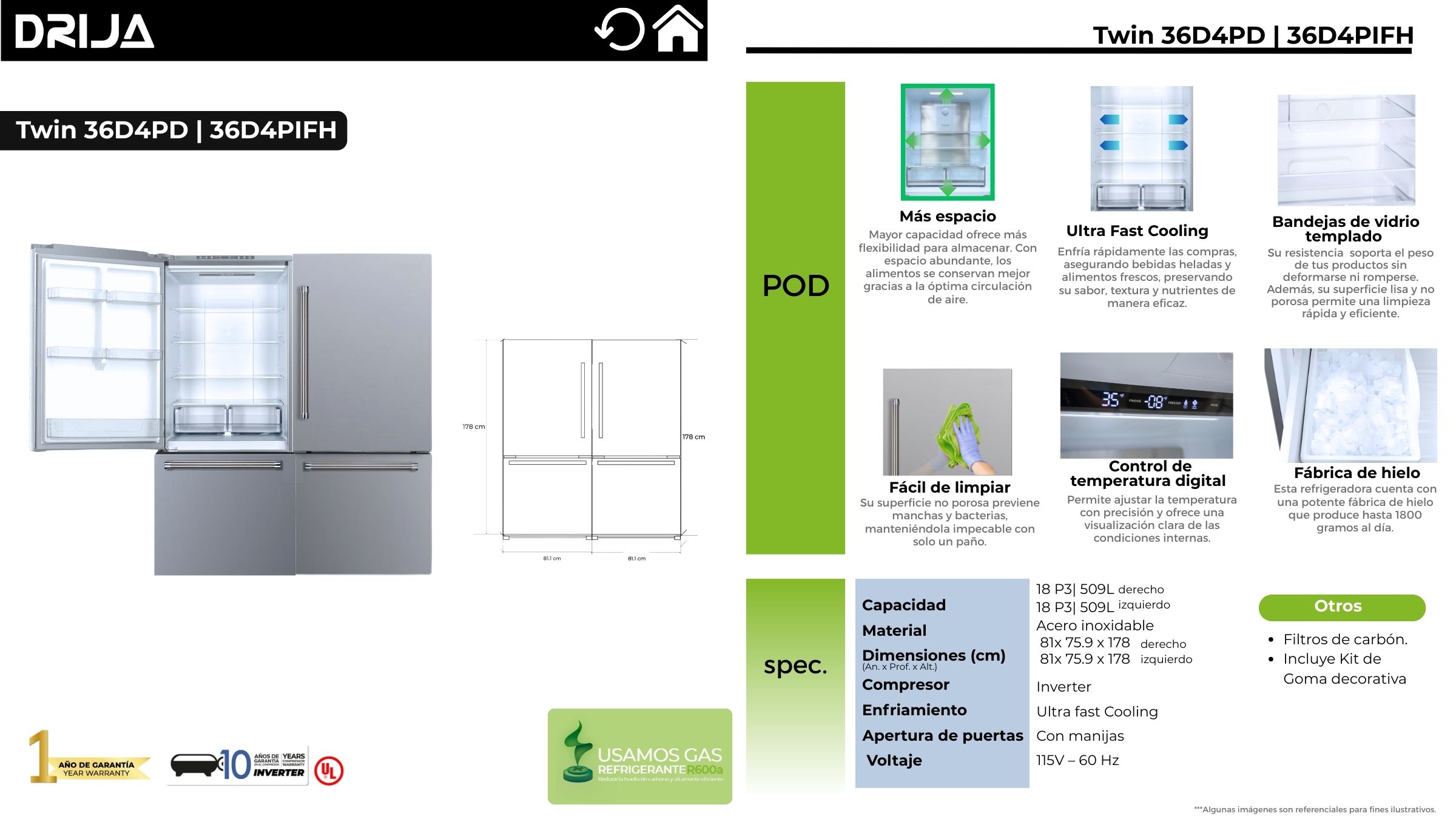 El TWIN 36D4PD de DRIJA está diseñado para ofrecer máxima capacidad y organización, con un sistema Inverter y tecnología Ultra Fast Cooling para un enfriamiento rápido y eficiente. Sus bandejas de vidrio templado garantizan resistencia y facilidad de limpieza, mientras que el control de temperatura digital asegura precisión en el manejo del frío. Además, incorpora fábrica de hielo y acabados en acero inoxidable para una apariencia moderna y duradera.